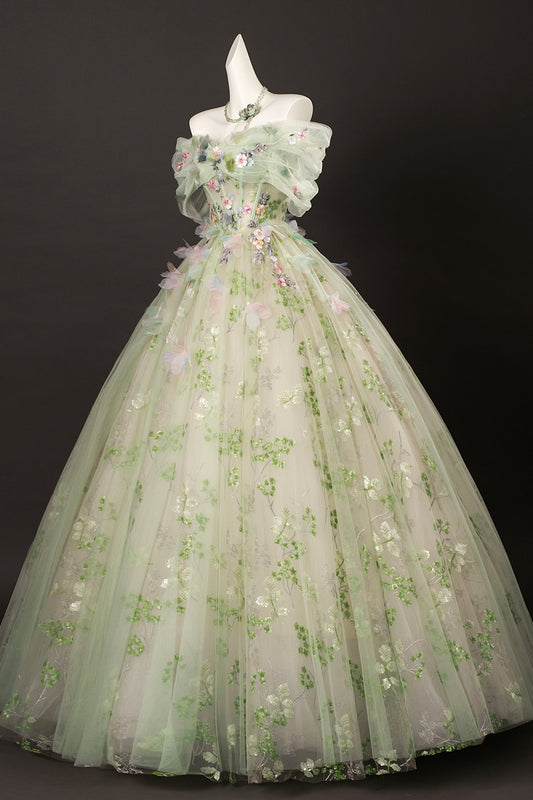 Green Tulle Floral Long Floor Length Formal Dress, Green A-Line Prom Party Dress