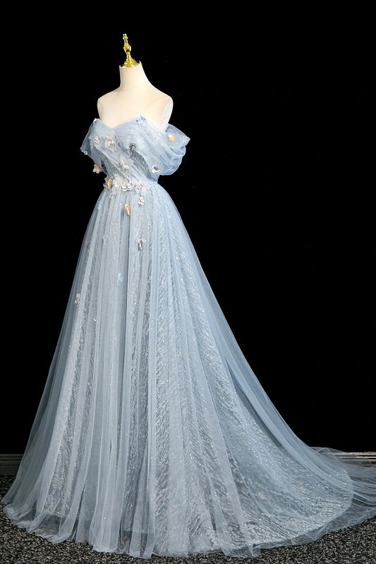 Blue Tulle Flowers Long Prom Dresses, A-Line Off the Shoulder Evening Formal Dresses