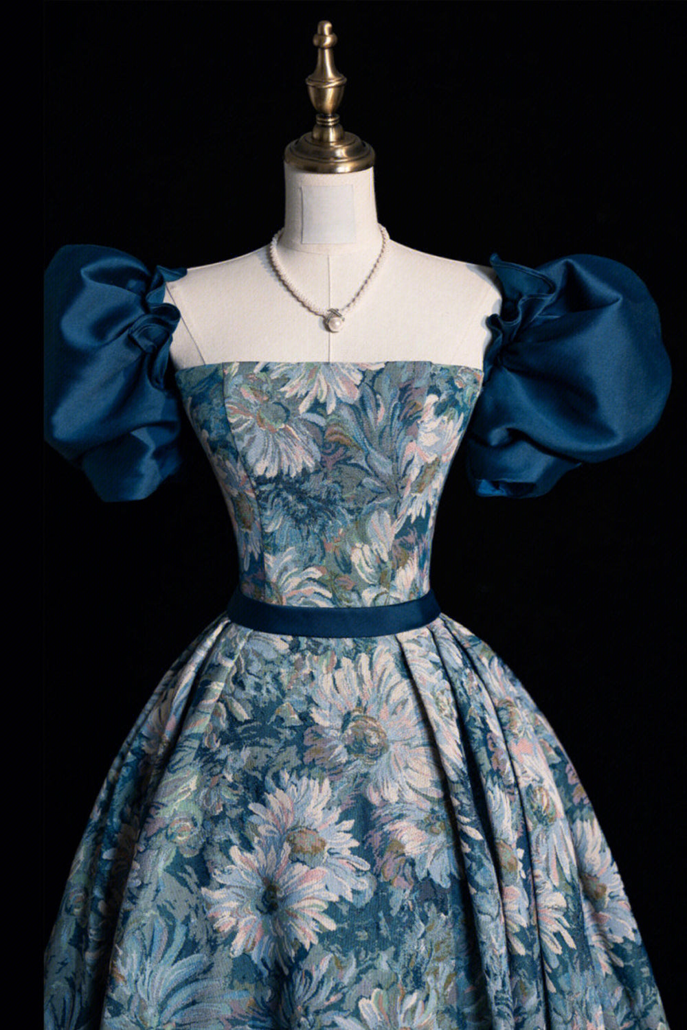 Blue Floral Long A-Line Prom Dress, Elegant Short Sleeve Evening Dress