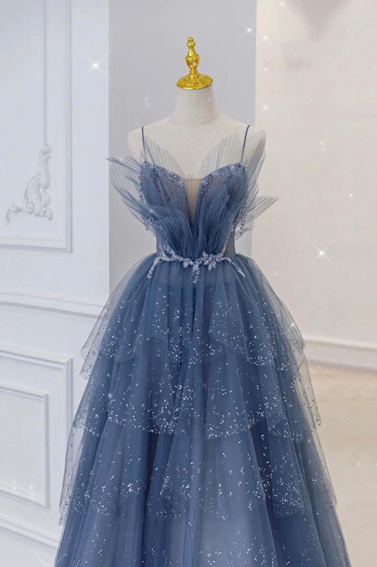 Blue Spaghetti Strap Tulle Beaded Long Prom Dress