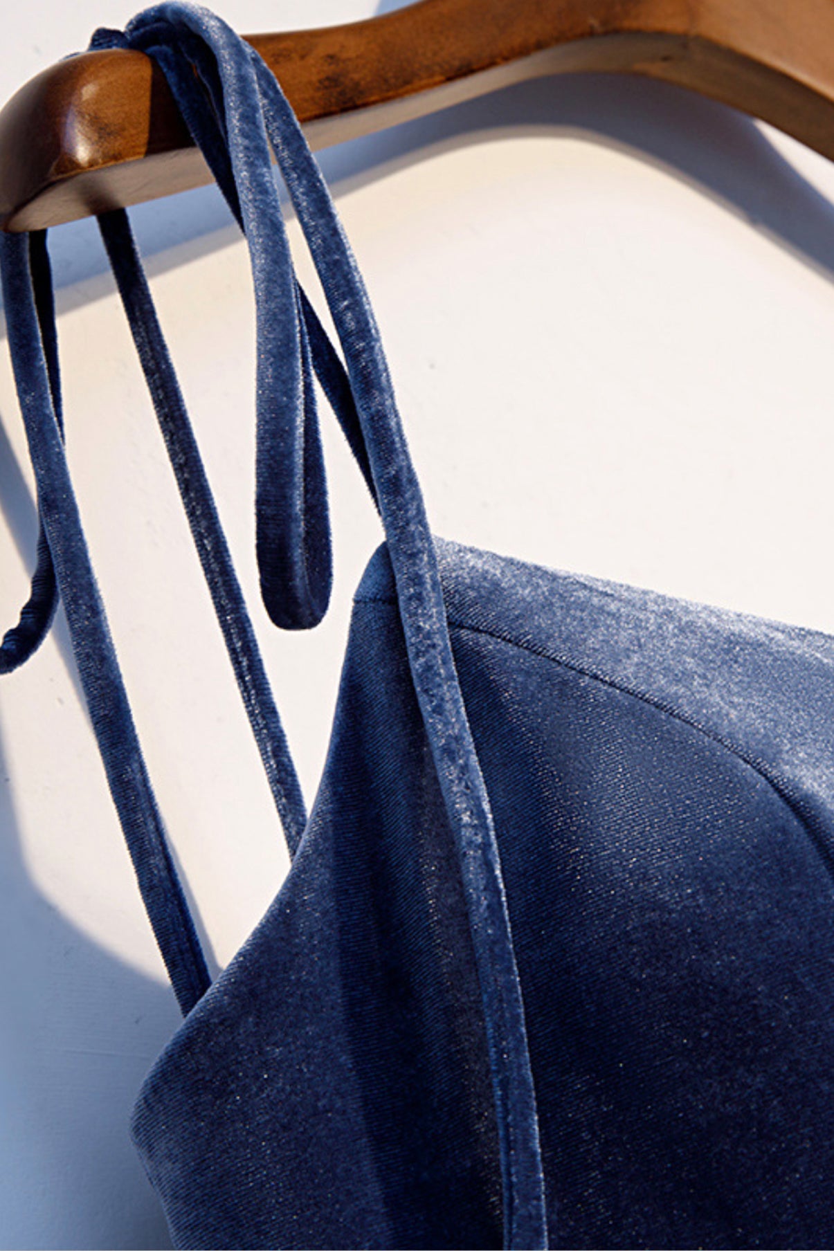 Blue Spaghetti Strap Velvet Tulle Long Prom Dress, Blue Tulle Evening Dress