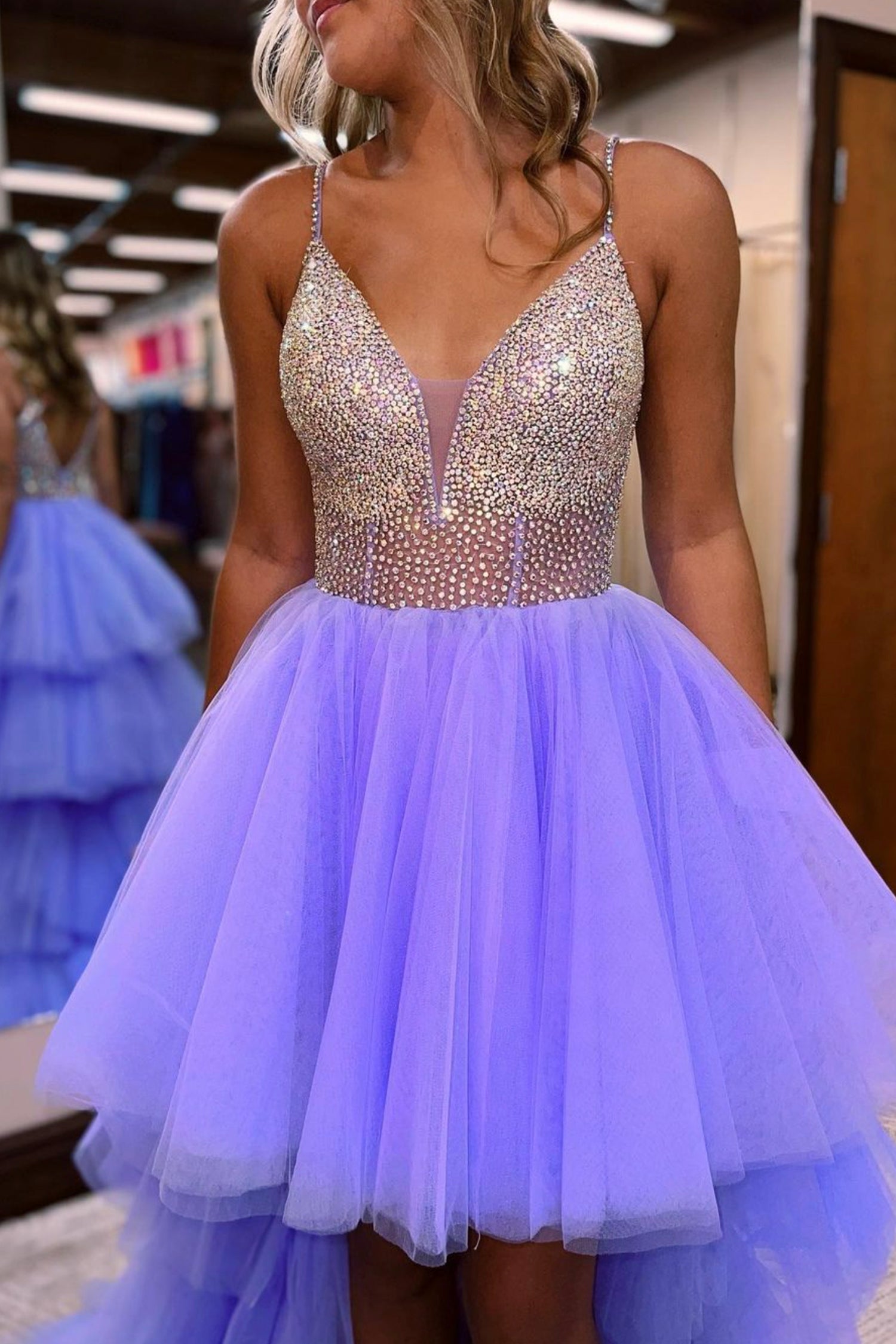 Purple V-Neck Tulle Long Prom Dresses, A-Line Beading Evening Dresses