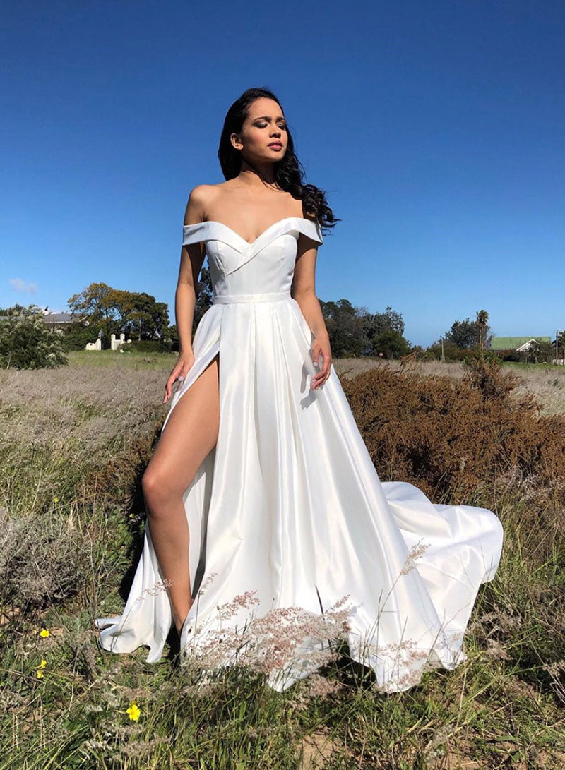 White Satin Long Prom Dress, Off the Shoulder Evening Party Dress with Slit